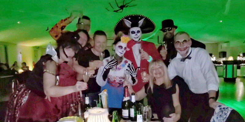 Unser Tanzsaal verwandelte sich liebevoll dekoriert mit Fledermäusen, Gespenstern und gleißendem Licht in eine schummrig-schaurige Party-Location. Lange Spinnenweben hingen von