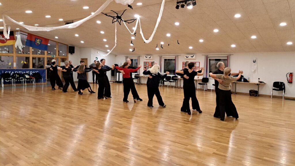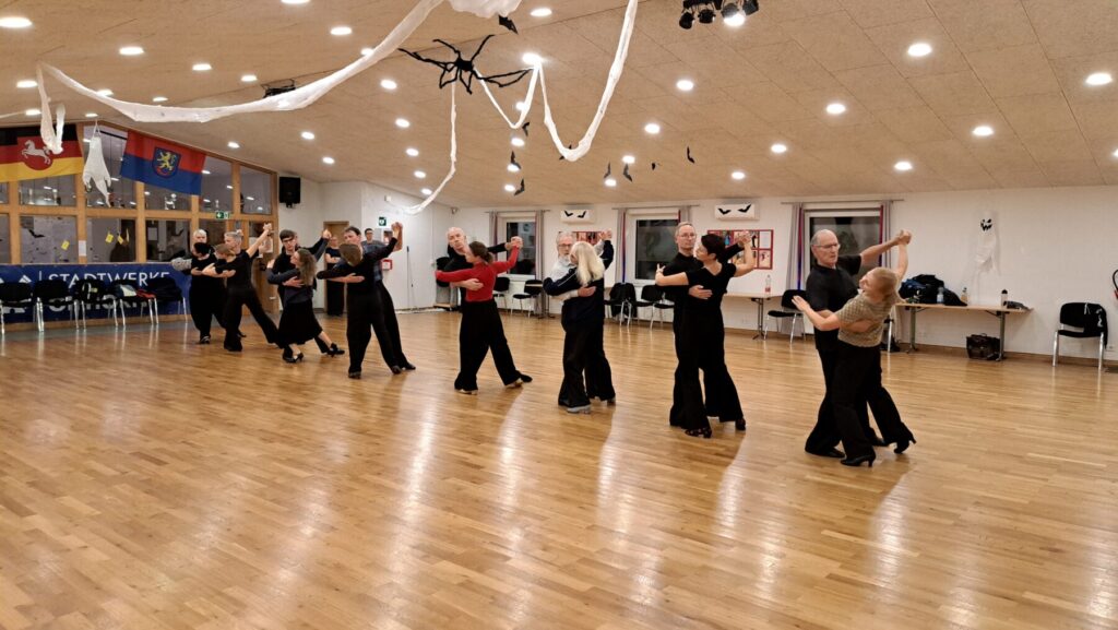 Die Standardformation setzt sich aus Paaren der Turnier-Basic-Gruppe und der Dienstag II-Hobbygruppe zusammen. Deshalb findet das Training auch immer zwischen den beiden Gruppen von 20.00 bis 20.45 Uhr statt. Neben den Figuren gilt es vor allem immer die Reihen zu halten, damit die Bilder für die Betrachter zu erkennen sind. Früher waren wir eine reine Seniorentruppe, aber wir haben uns verjüngt. In der Formation trainieren derzeit neun Paare, vier davon tanzen keine Turniere, die sind dann noch ab 20.45 weiter dabei. Fünf Paare tanzen inzwischen in der Masters III/IV in der A- und S-Klasse, haben also vorher ihr Training.